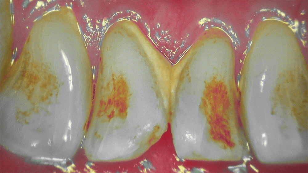Mise en exergue de la plaque dentaire et de l’inflammation gingivale grâce à l’amplification chromatique.