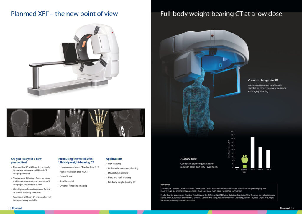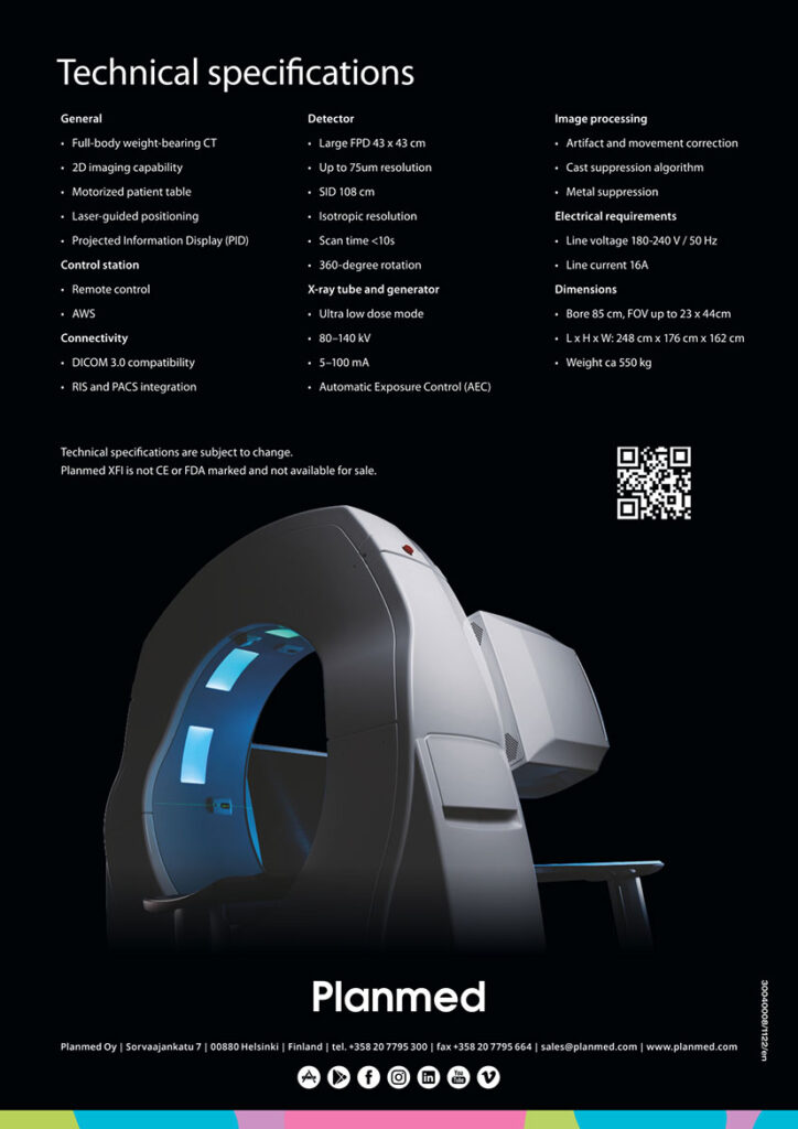 Planmed XFI® est un système unique de tomographie volumique à faisceau conique (CBCT) offrant une imagerie complète de l’ensemble du corps, de la tête aux pieds, aussi bien en position debout (en charge) qu’en position allongée (décubitus).